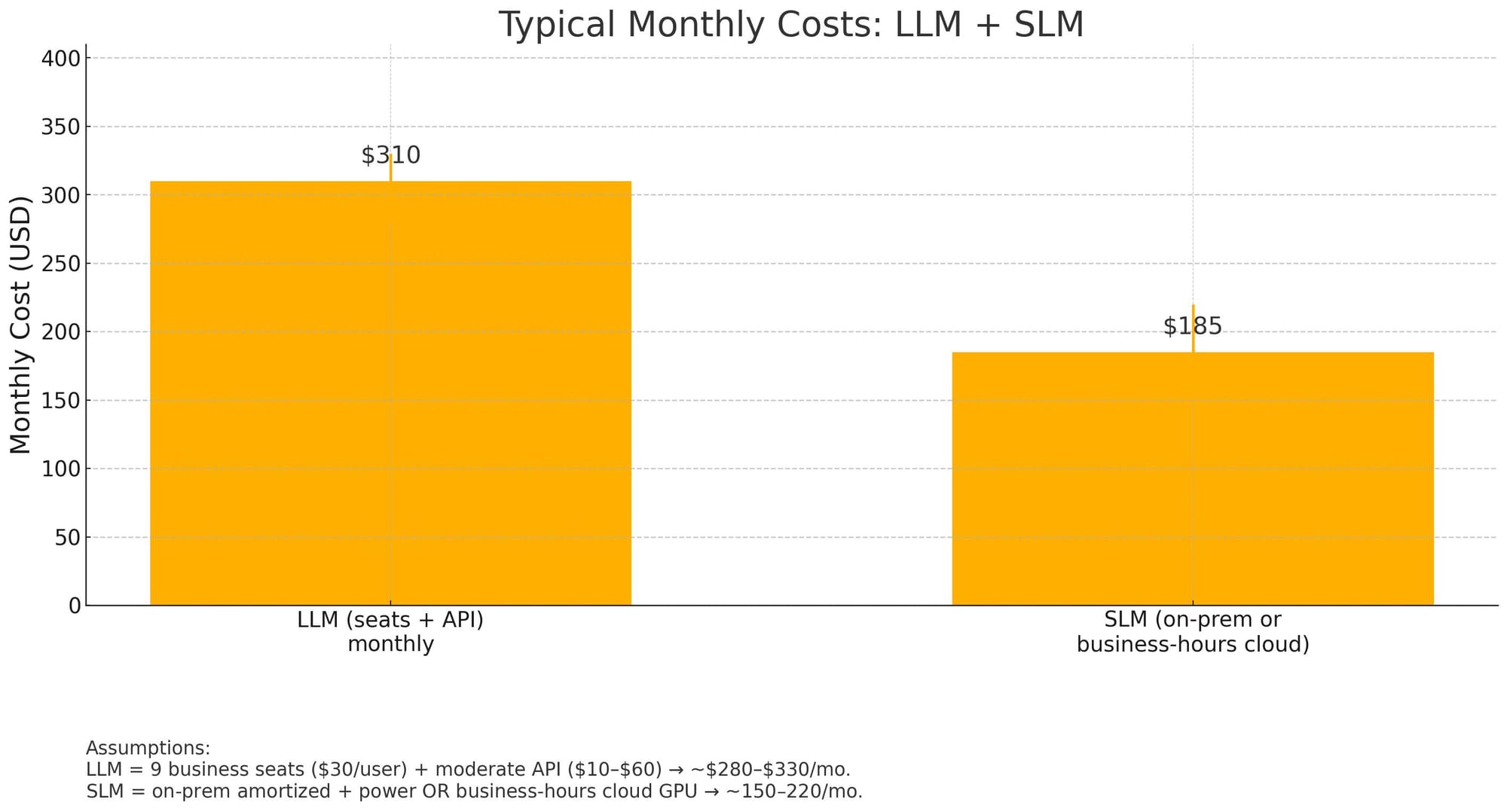 Typically, the SLM operates at low cost and helps reduce the total software costs of overall. The LLM license and SLM can operate at well under $100 per month per seat (massively increasing productivity while also eliminating the need for other software currently in the budget). For a five-person firm with 4 staff, both models can run for around $60 per month per seat.